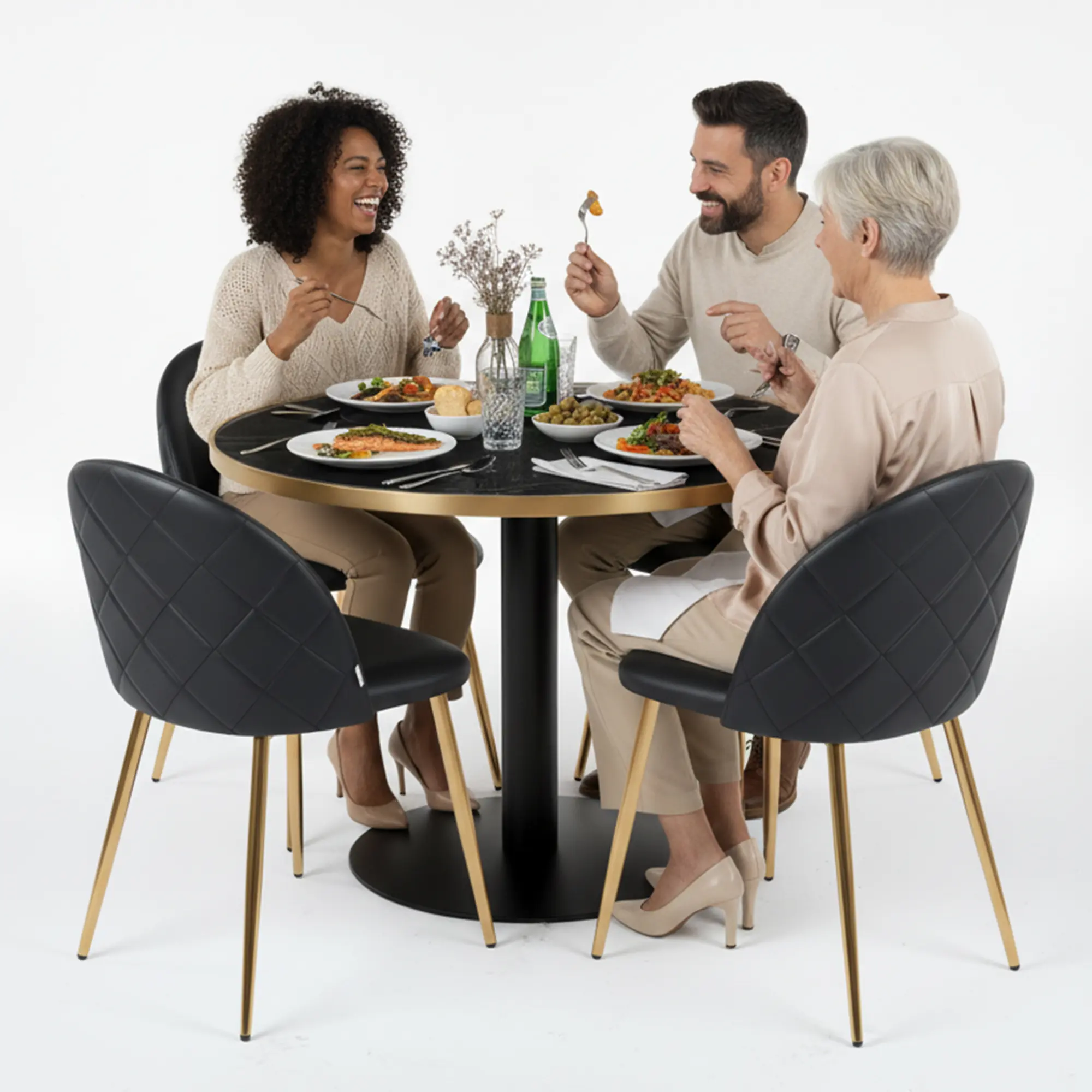 Convierte cada mesa en un punto de atracción para tus clientes con el conjunto de comedor Ambala que transformará cualquier sala en un espacio más atractivo y rentable. Su estética en mármol negro capta la mirada desde el primer momento, mientras su formato redondo facilita la interacción entre comensales, aumentando el tiempo de estancia y consumo. La combinación de tablero efecto mármol negro con base metálica crea una imagen sofisticada que encaja en restaurantes contemporáneos, cafeterías premium o espacios contract con identidad cuidada. Este tipo de acabados transmite calidad visual sin disparar la inversión, lo que ayuda a posicionar tu negocio en un nivel superior sin comprometer márgenes.