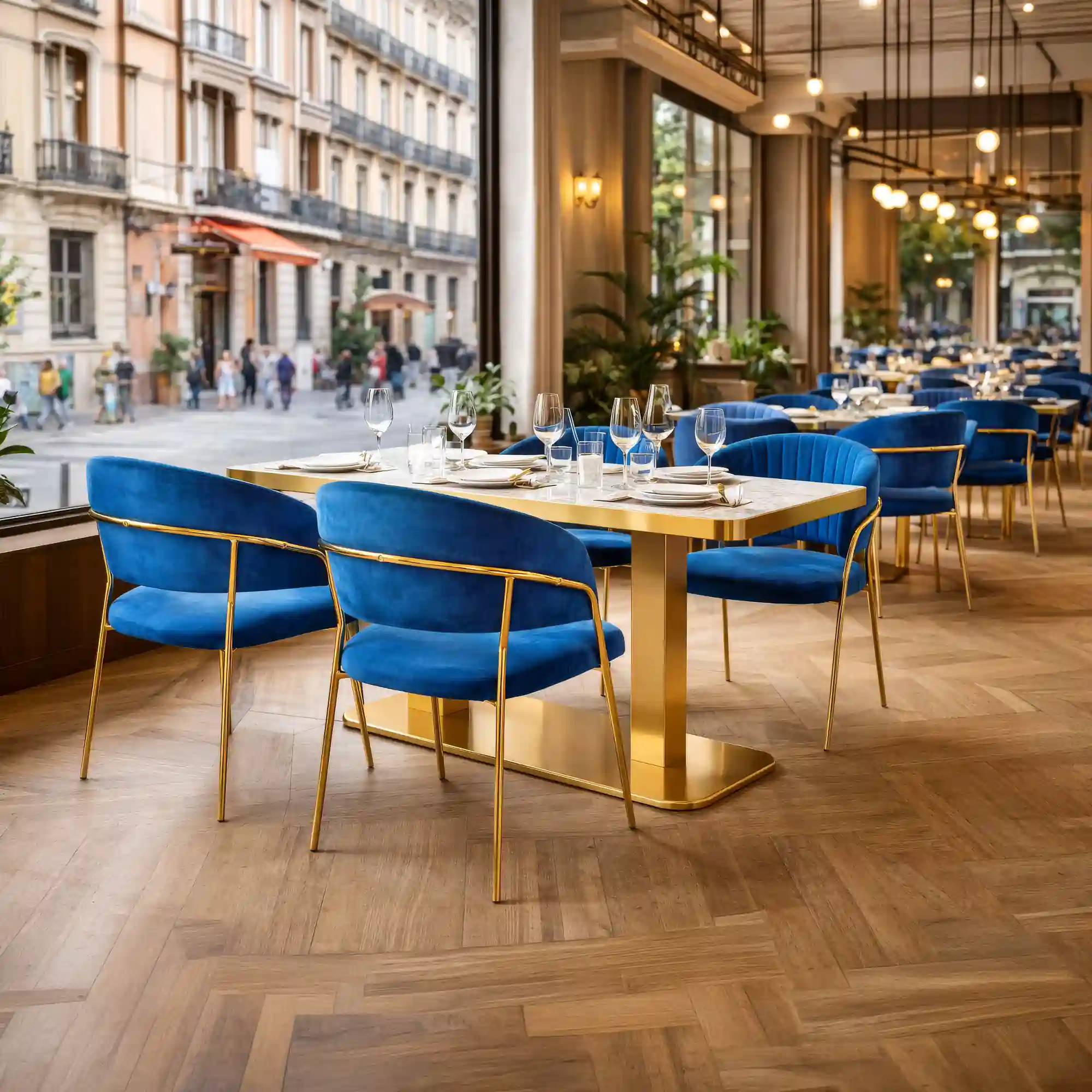 • Tablero de mesa de piedra sinterizada y canto dorado.