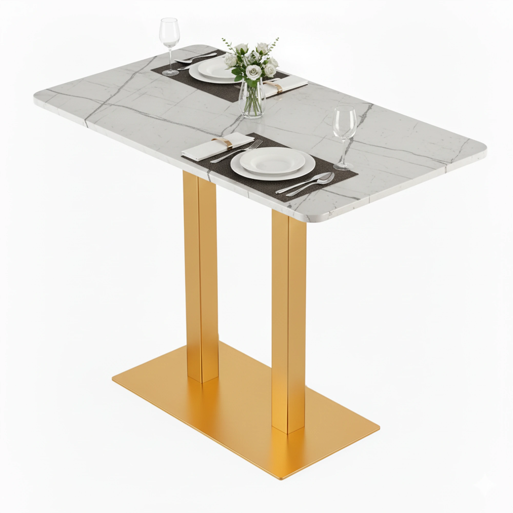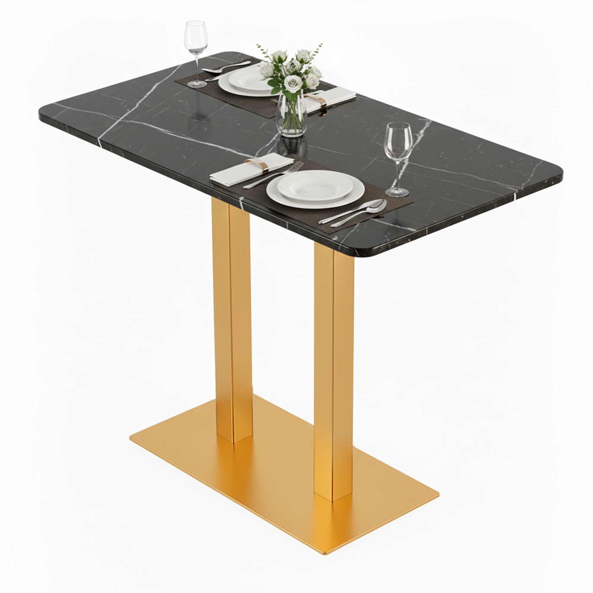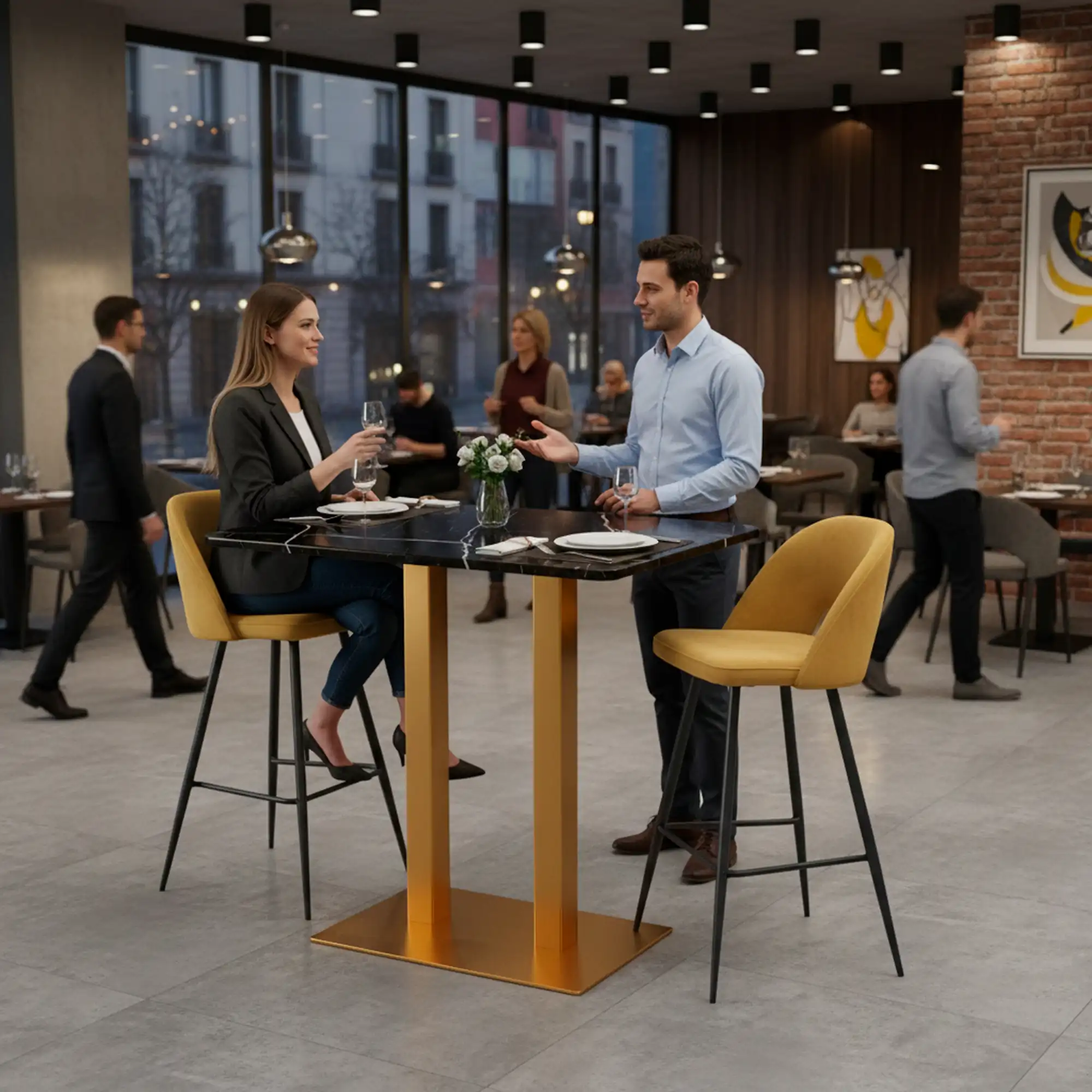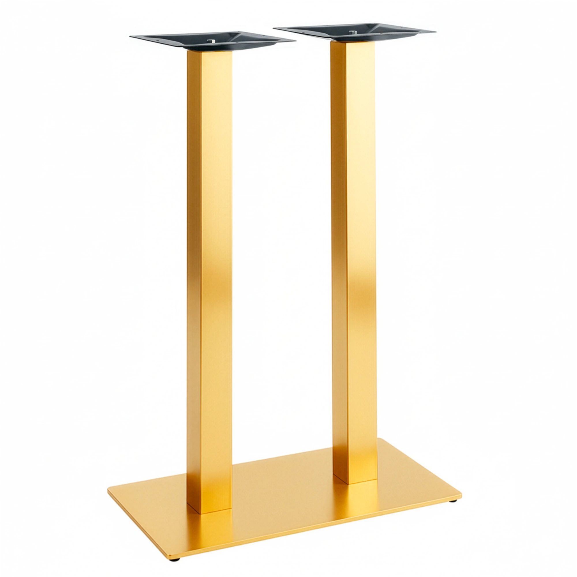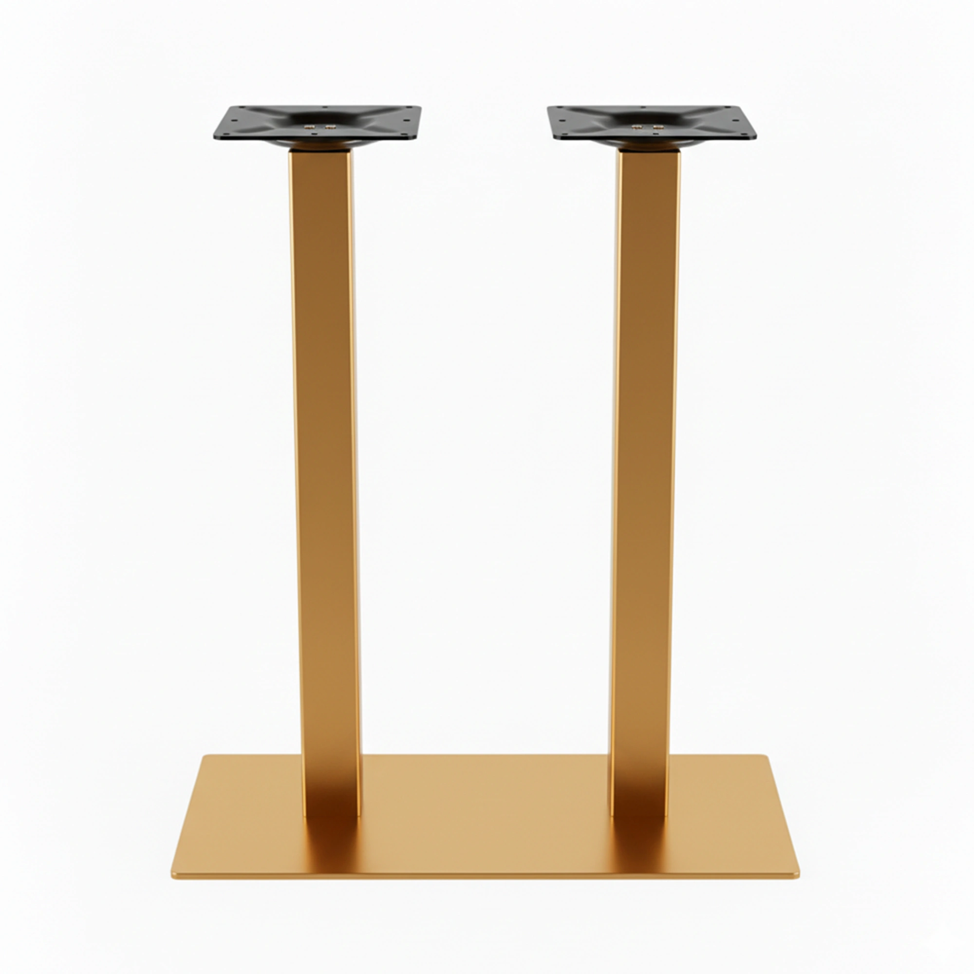 Este pie está pensado para que tú no tengas que preocuparte por la integridad de tus mesas en días de gran afluencia. La estructura de doble columna reduce los puntos de flexión que suelen producirse en bases más delgadas, lo que reduce incidencias de mantenimiento. Además, el acabado dorado facilita una integración elegante con tableros en tonos de mármol o colores modernos, elevando el diseño de tu sala o terraza.