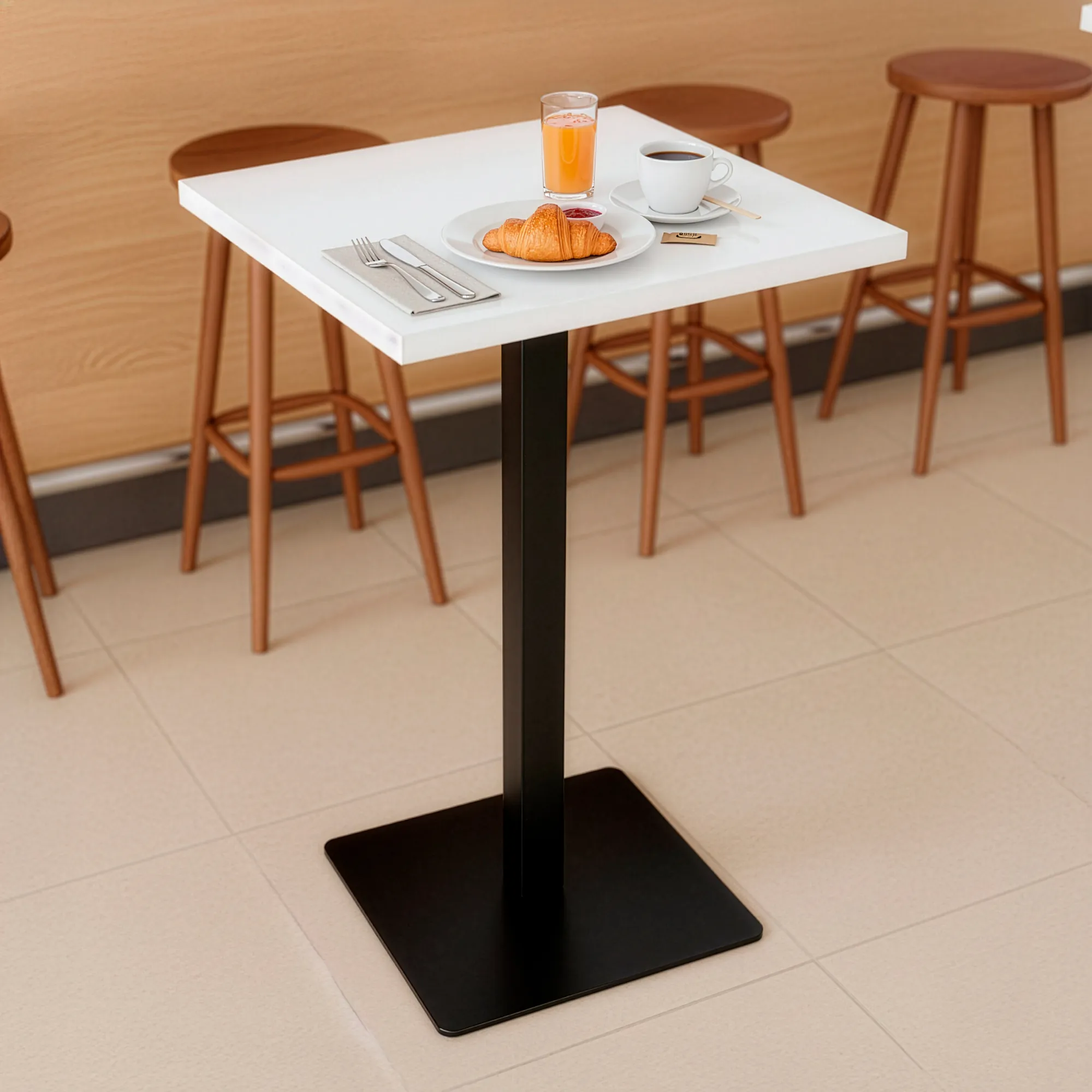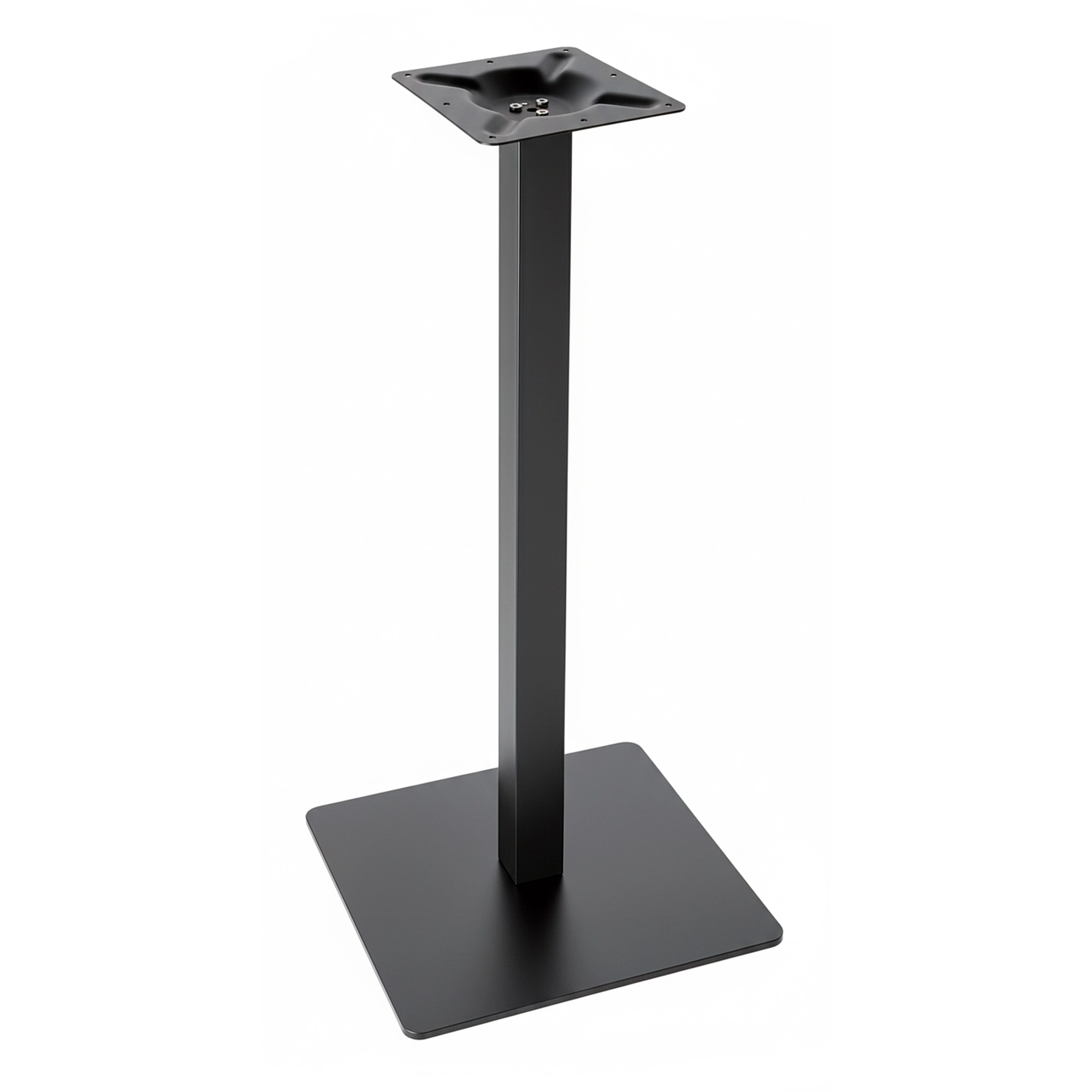 La base cuadrada de este pie permite colocar tableros cuadrados — ideales para mesas altas de 60 x 60 cm, 70 x 70 cm o similares — muy habituales en terrazas compactas o barras exteriores. La altura elevada facilita que comensales usen taburetes o permanezcan de pie, perfecta para zonas de aperitivo, afterwork o ambientes informales.