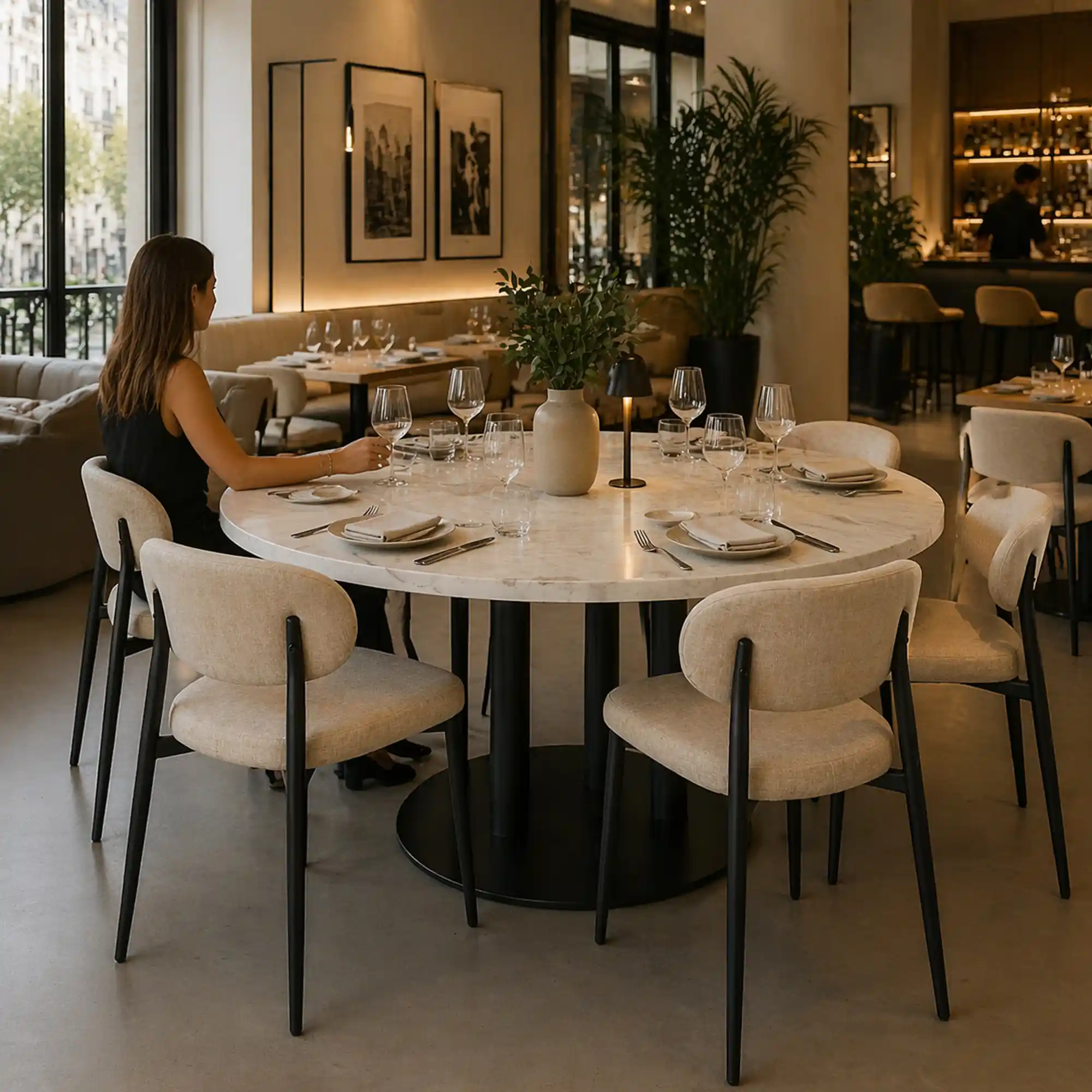 En proyectos de restauración, este diseño ayuda a optimizar la capacidad sin sacrificar comodidad ni estética. El formato de pie central elimina obstáculos bajo la mesa, lo que facilita la movilidad tanto para clientes como para el personal de sala. Este tipo de estructura es especialmente valorado en restauración porque: