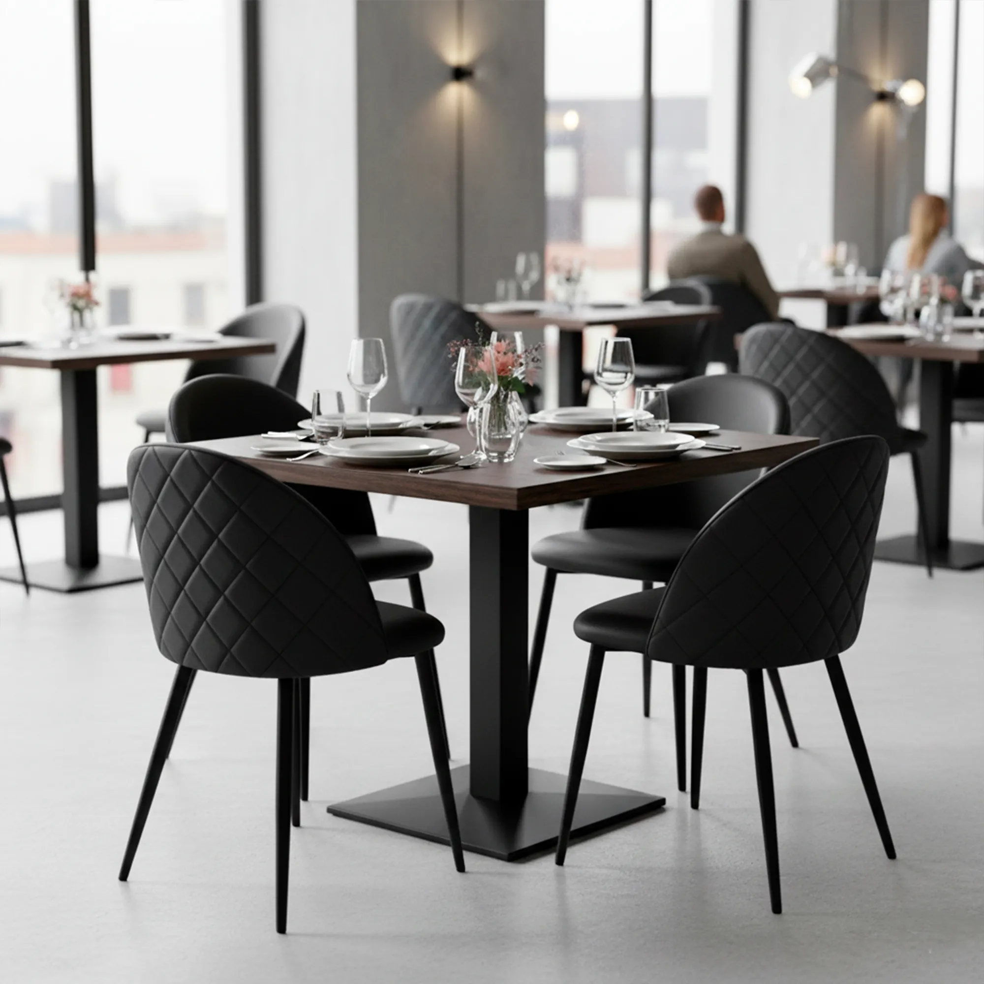 En el mundo de la hostelería cada detalle cuenta y la comodidad del cliente, la rapidez en limpieza y la durabilidad de los muebles contract que marcan la diferencia. Aquí entra en juego nuestra silla de comedor en polipiel Yumi, pensada especialmente para locales que quieren combinar diseño y funcionalidad eficiente. Nuestra silla de polipiel de interior Yumi está fabricada con una estructura de hierro lacado en negro, que asegura robustez ante el uso intensivo en bares, cafeterías o restaurantes.