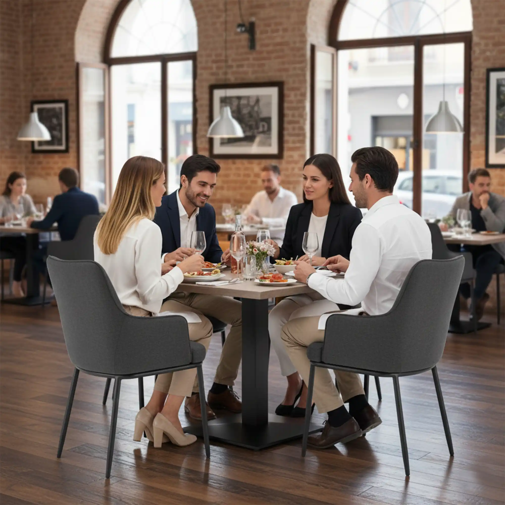 Gracias a su tapizado de calidad y diseño confortable, nuestra silla tapizada de comedor Ángela ofrece una experiencia de asiento más prolongada que favorece que los comensales se sientan bien atendidos y cómodos. Su tapizado suave y la estructura metálica suman una estética contemporánea, proporcionando la mejor imagen del local sin necesidad de cambiar toda la decoración. La construcción metálica también facilita la limpieza y mantenimiento, ya que no requiere materiales complejos o delicados. En conjunto, esta combinación reduce el esfuerzo de mantenimiento y permite mantener un mobiliario de hostelería digno del negocio sin interrupciones.