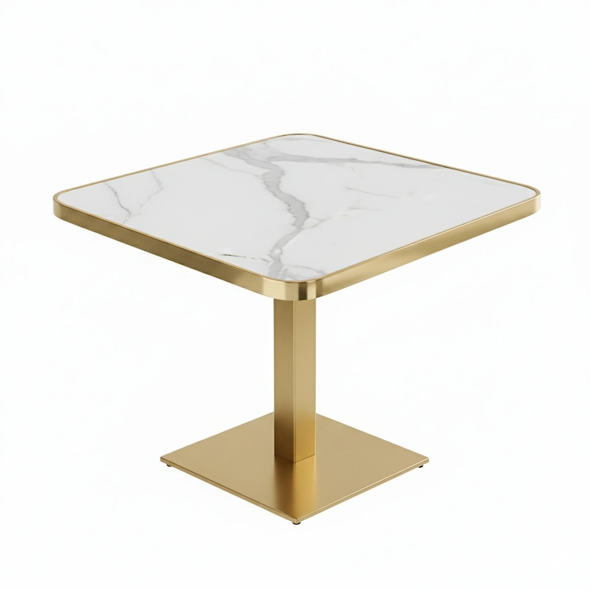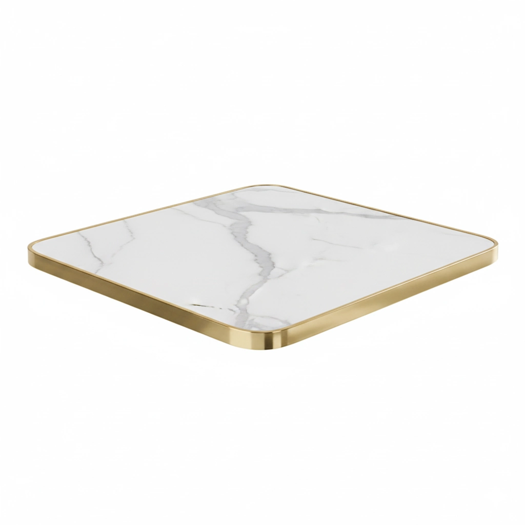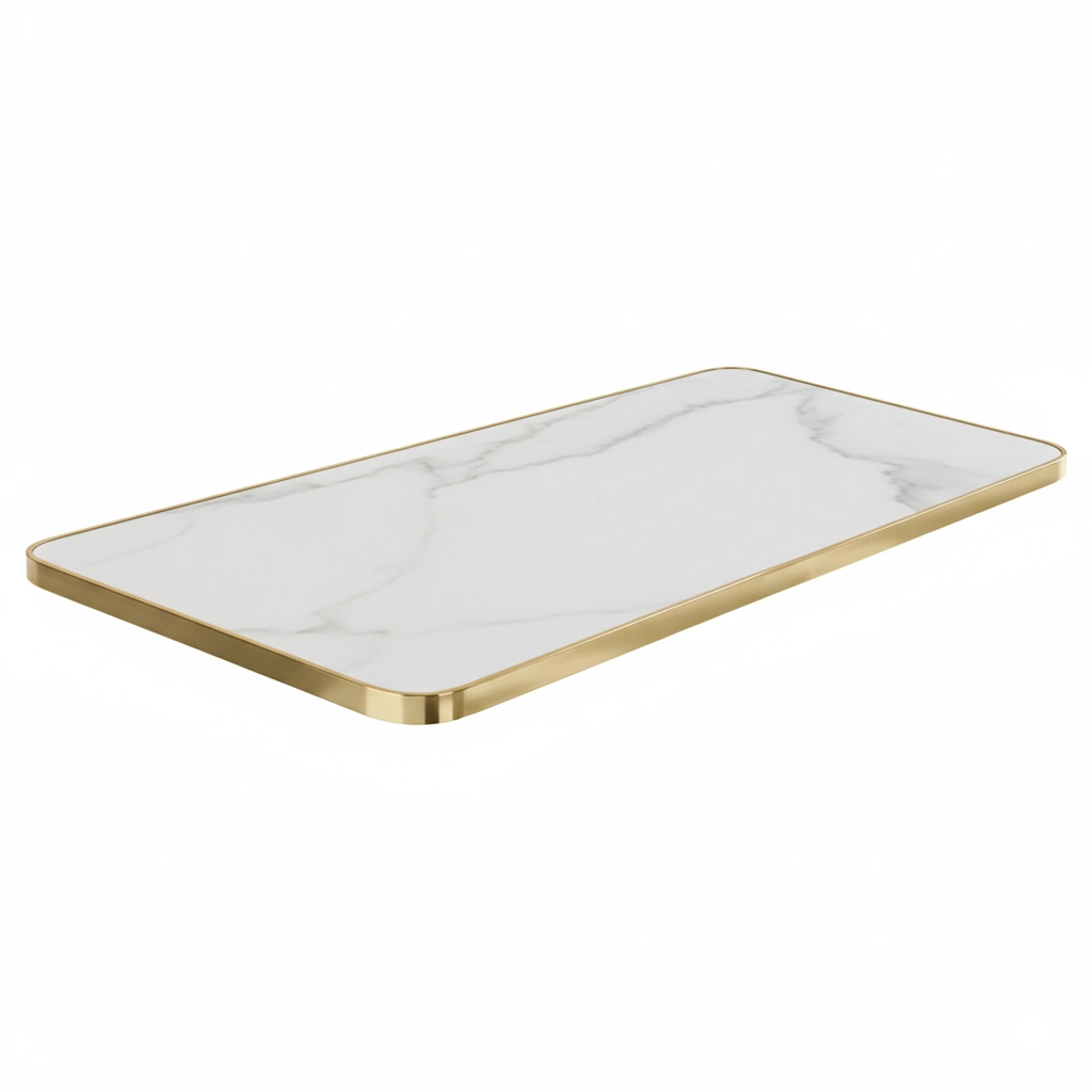 El tablero de mesa en mármol blanco mate con cantos en acero inoxidable dorado es la opción perfecta para proyectos de hostelería y contract que buscan un diseño sofisticado y resistente. Su acabado elegante con vetas naturales sobre superficie de piedra sintetizada ofrece una estética de lujo que se adapta a restaurantes, cafeterías, bares y hoteles.