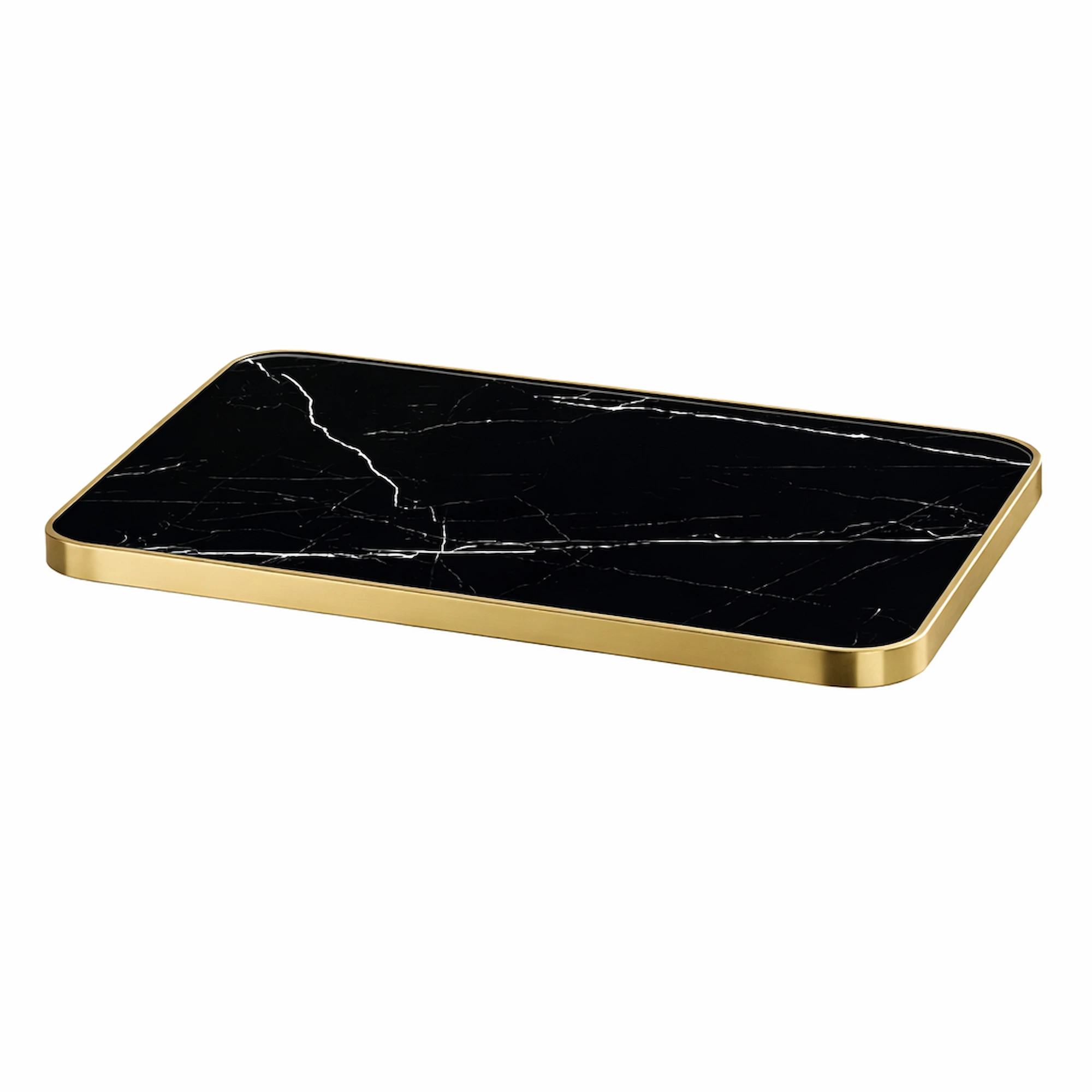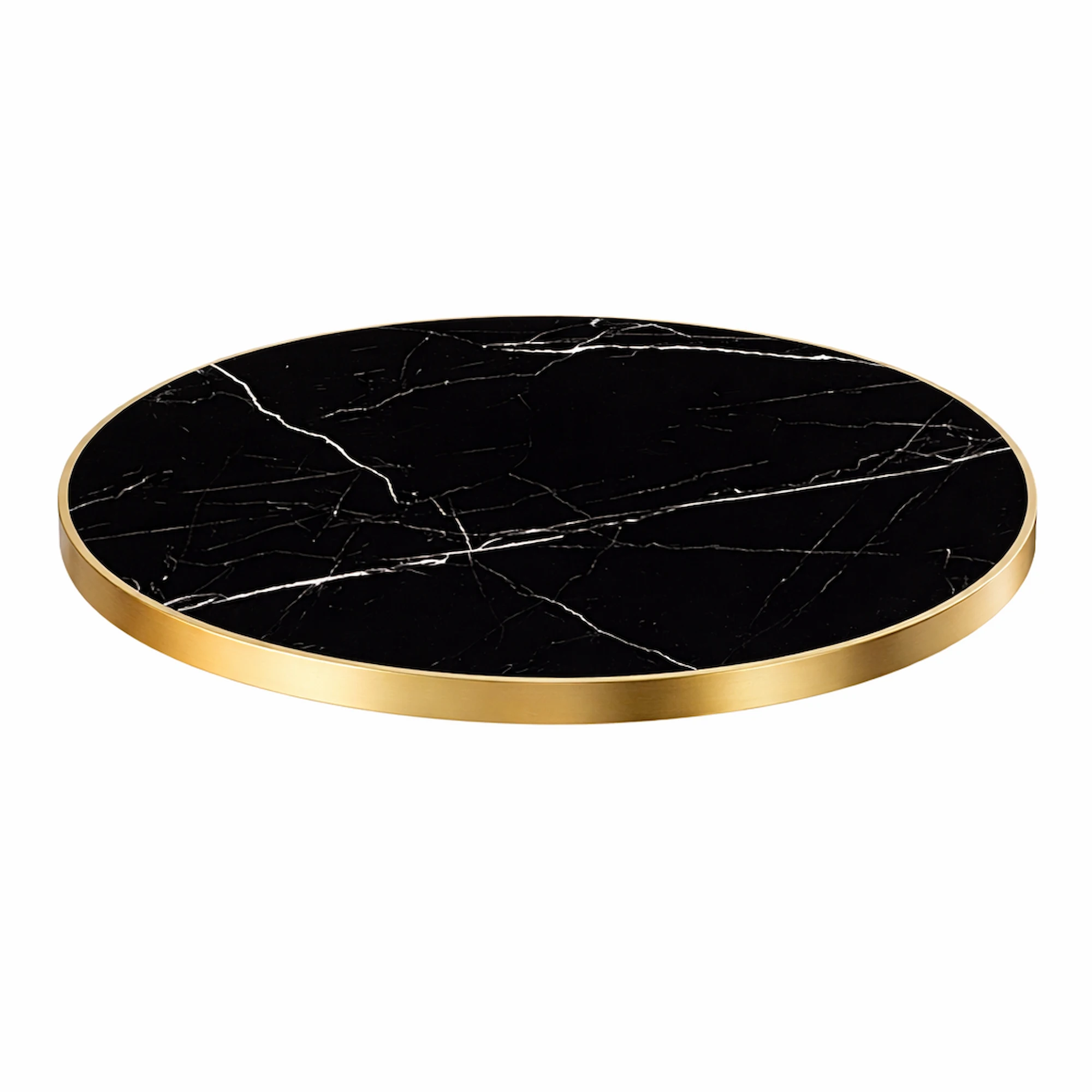 Tablero para mesa de mármol negro en piedra sinterizada ideal para bares, restaurantes y cafeterías que buscan unir resistencia profesional y diseño elegante. Nuestra piedra sinterizada garantiza una superficie duradera, fácil de limpiar y resistente al calor y a los arañazos, su acabado en mármol negro brillo con canto de acero inoxidable dorado aporta un toque de sofisticación que realza cualquier espacio de hostelería.