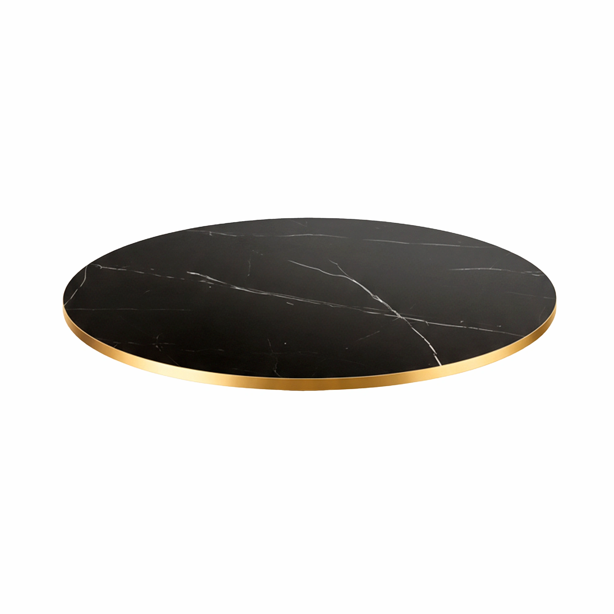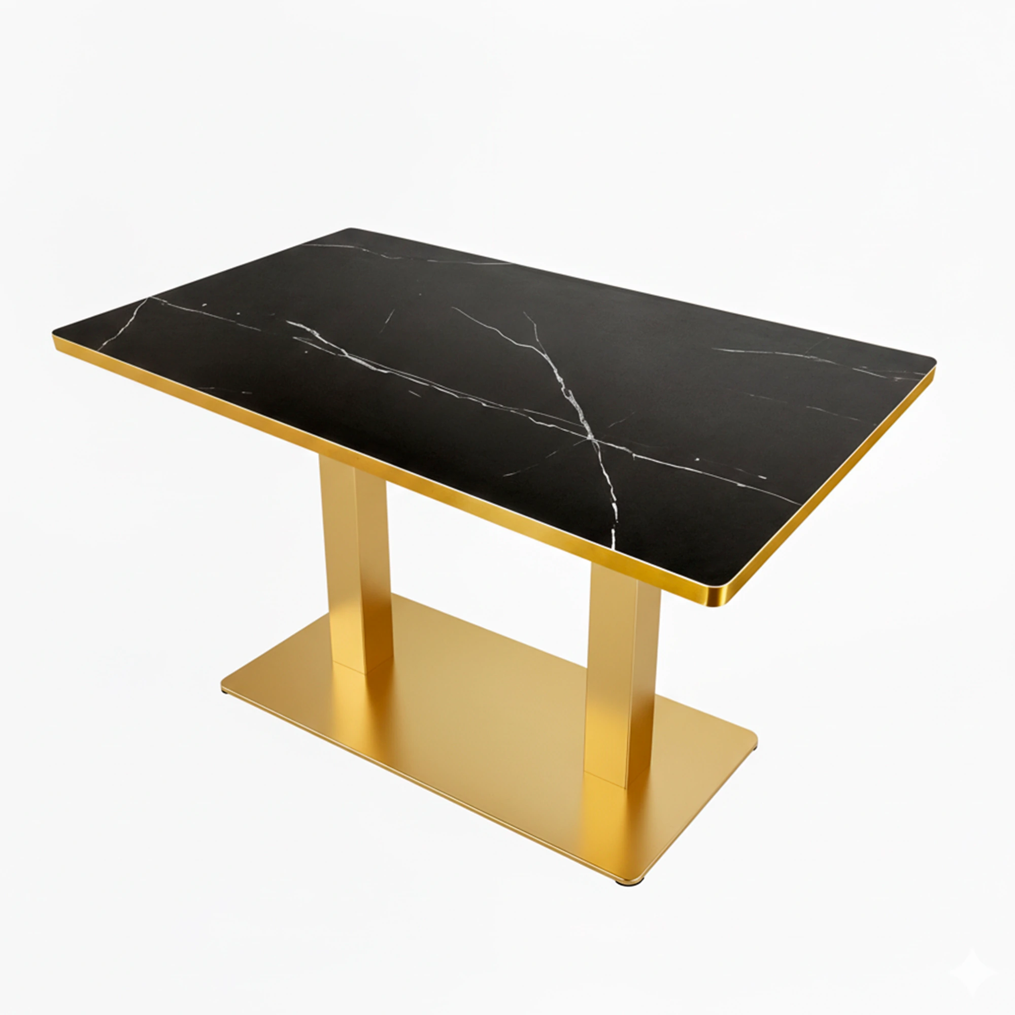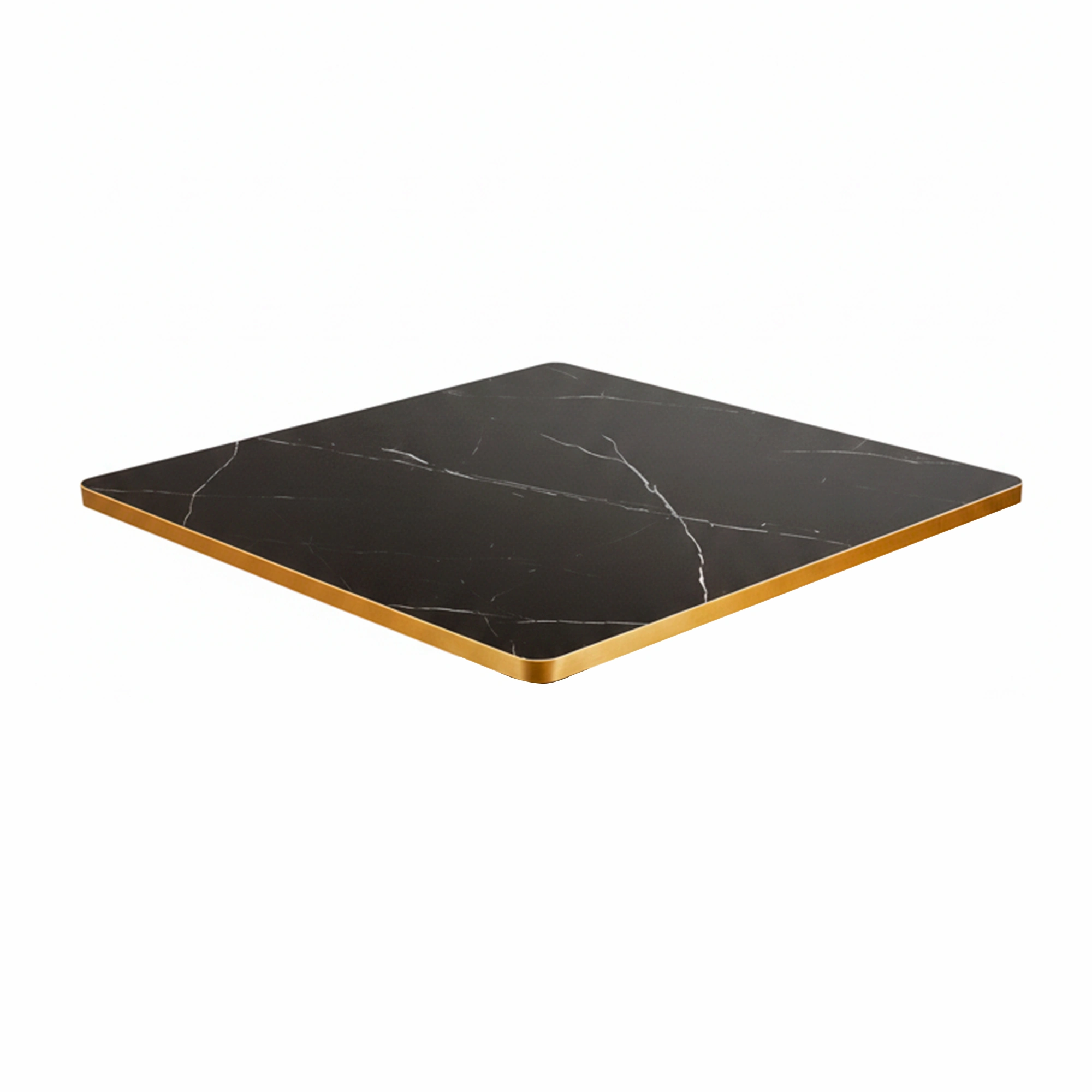 Tablero de mesa imitación mármol negro con canto dorado: la unión perfecta de diseño, resistencia y sofisticación para tu negocio de hostelería.