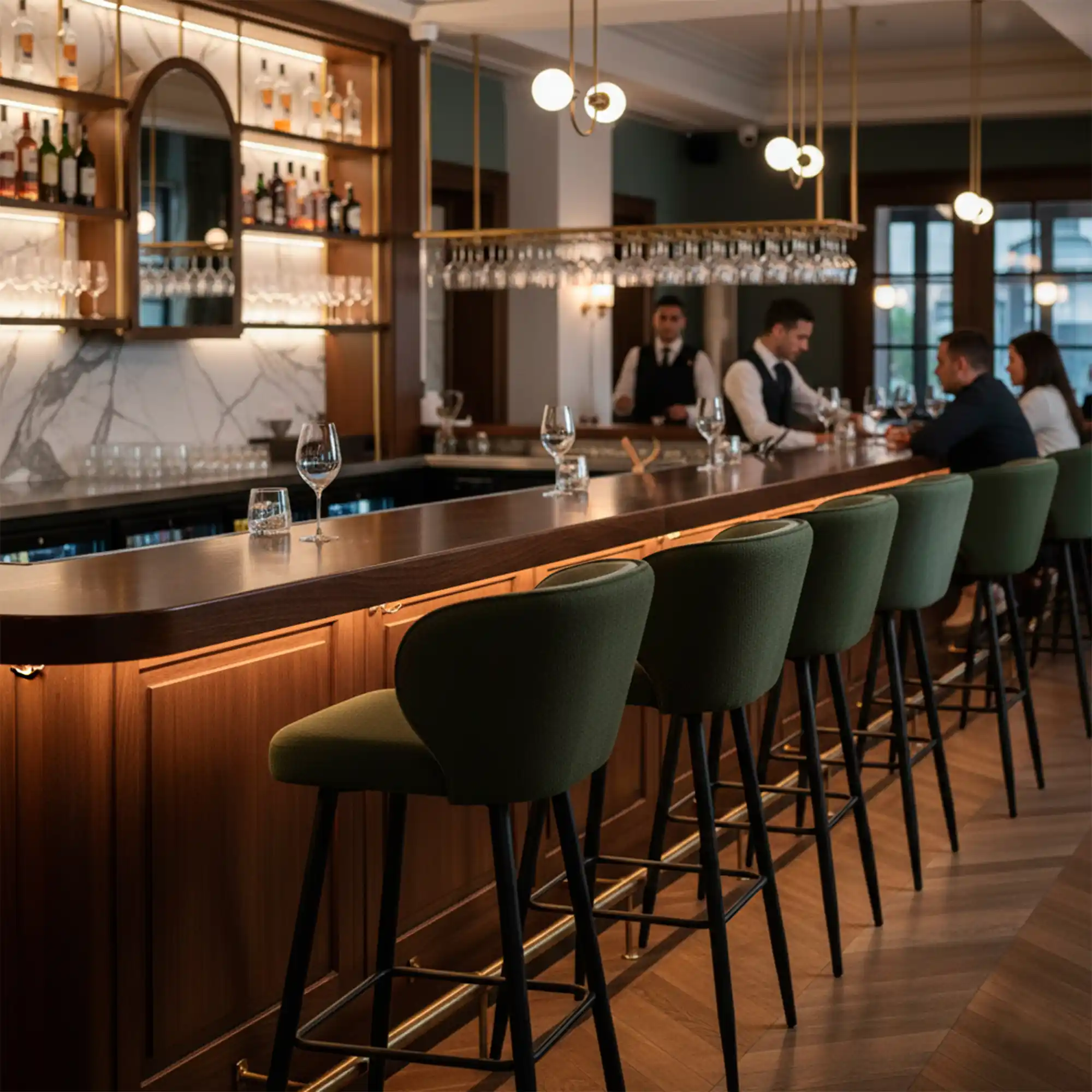 Gracias a su respaldo alto, el taburete Celia ofrece una ventaja clara: los clientes se sienten más cómodos y tienden a permanecer más tiempo en la zona de la barra, lo cual incrementa el ticket medio por cliente. Su tapizado y estructura robusta implican que no tendrás que estar cambiando mobiliario cada temporada, sino que inviertes una sola vez para largo plazo. Además, al combinar diseño y funcionalidad, contribuye a que la imagen del local se perciba como más cuidada y profesional.