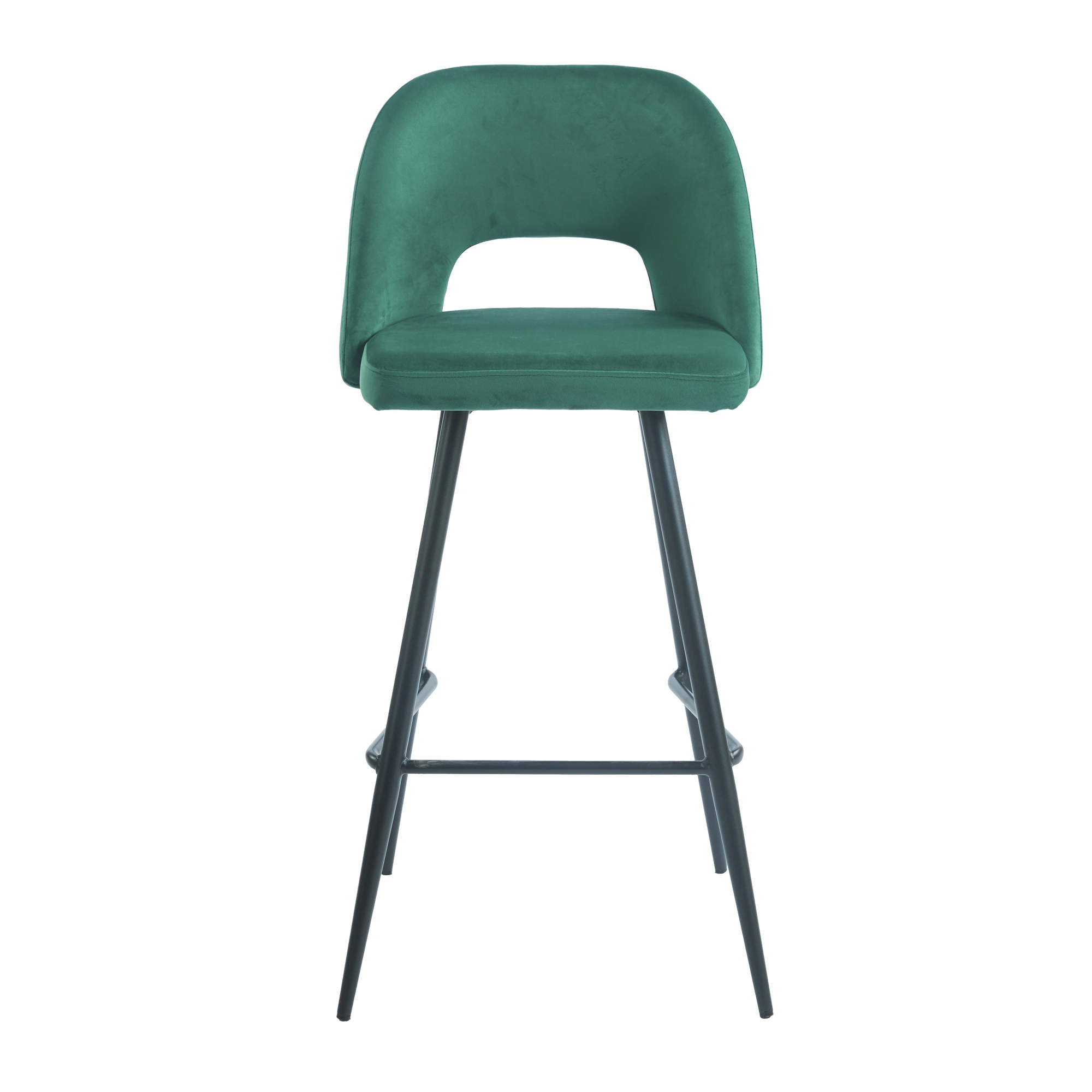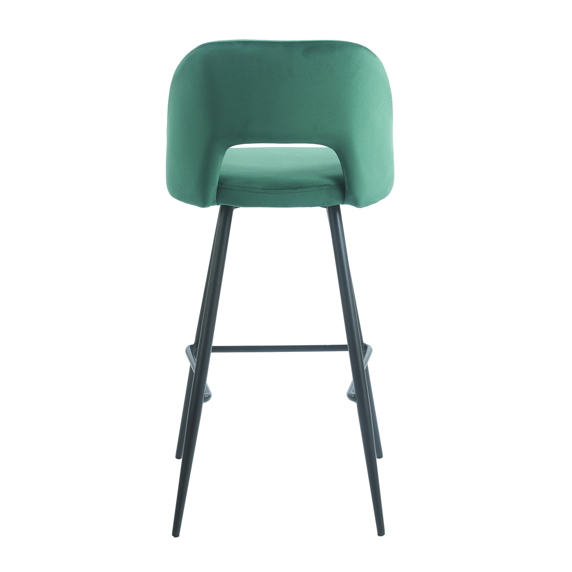 El taburete Frodita cuenta con una estructura fabricada en acero pintado en negro, un material robusto y apropiado para entornos contract. Su asiento y respaldo están tapizados en terciopelo, disponible en dos tonos elegantes: verde y mostaza. El respaldo aporta soporte para la espalda, algo valorado cuando los clientes se quedan más tiempo. Gracias al tapizado, el asiento no solo es cómodo sino que también transmite una sensación de calidad superior.