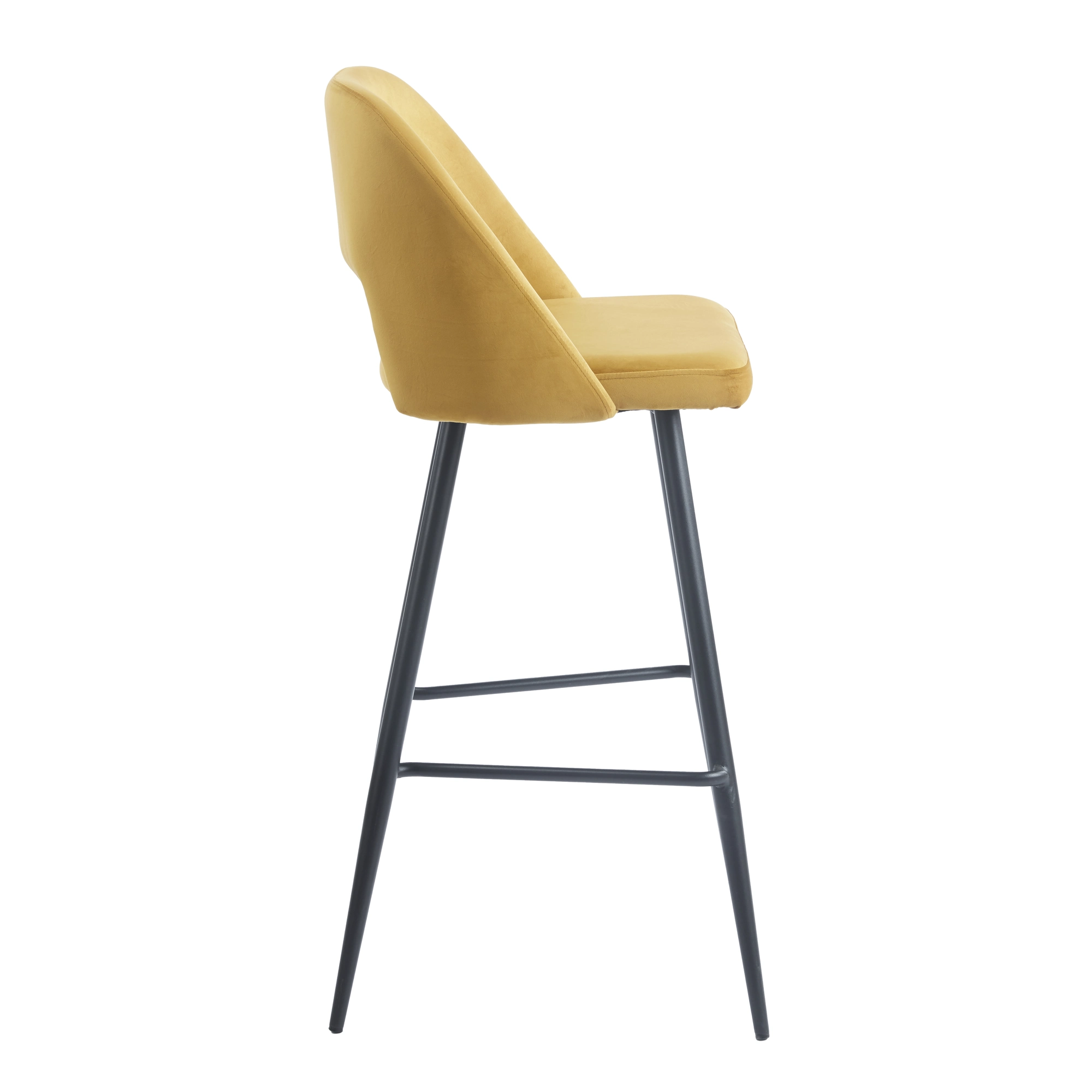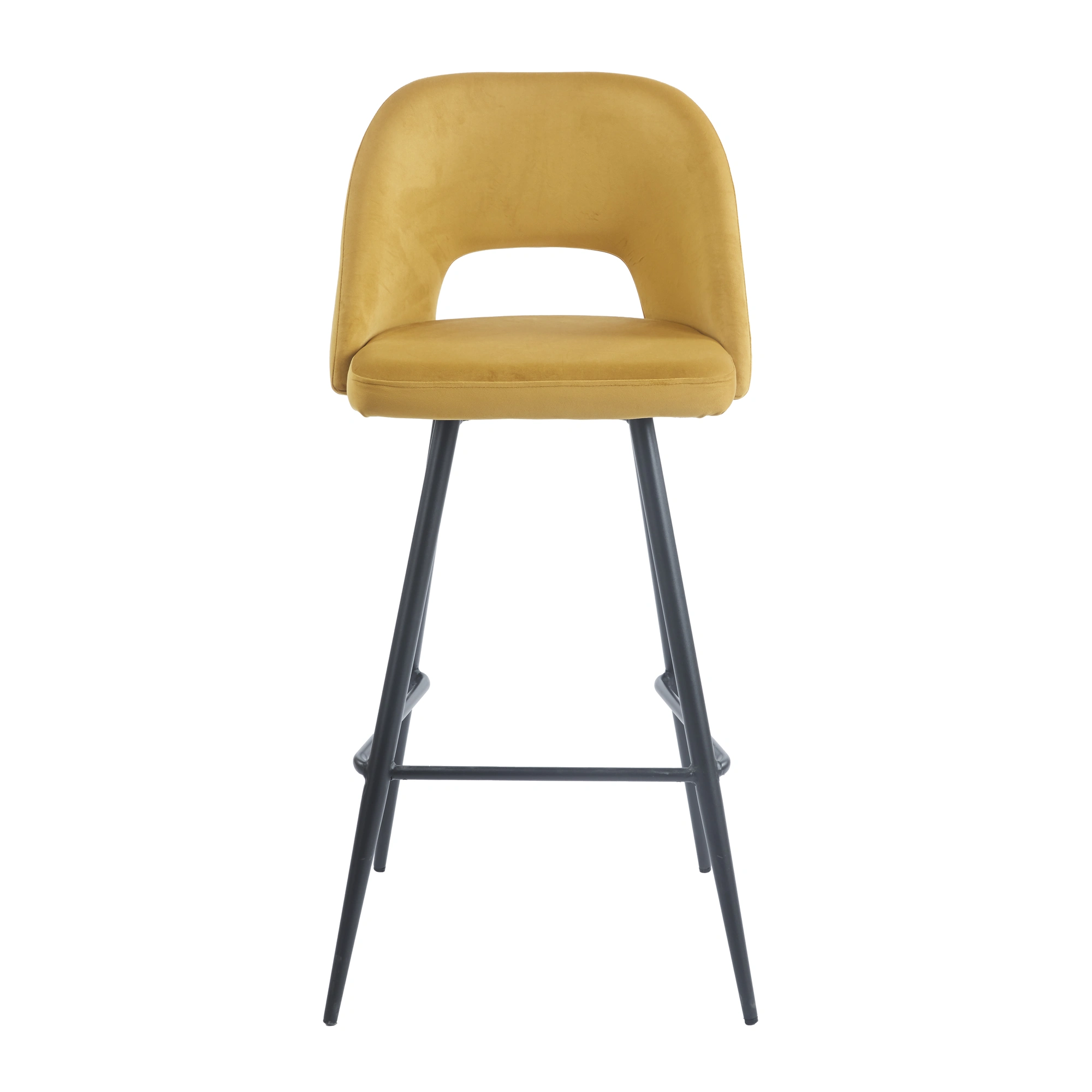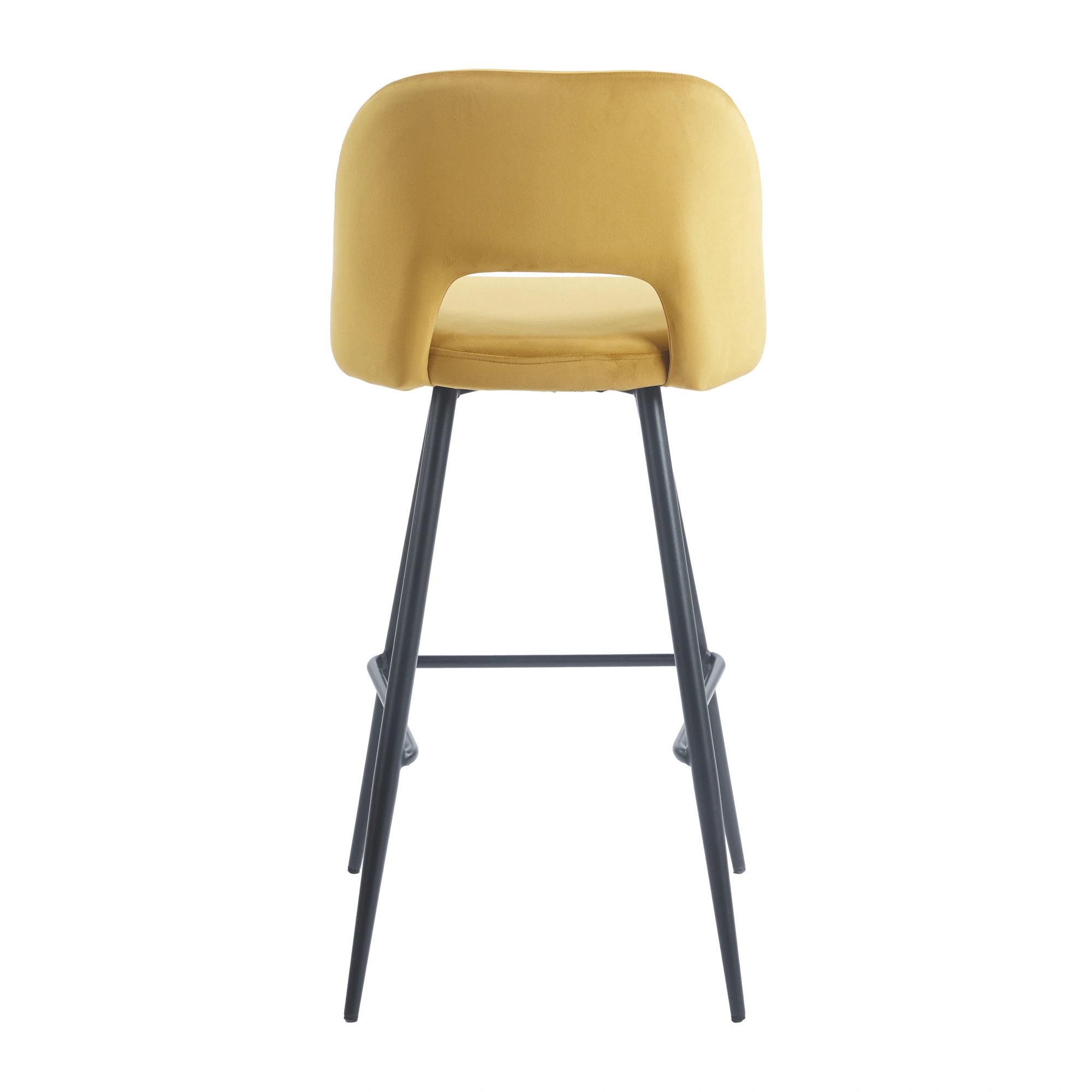 Nnuevo taburete alto tapizado Frodita con estructura de acero negro y terciopelo en verde o mostaza. Con respaldo cómodo, diseño profesional para bares, cafeterías y restaurantes aun precio irresistible.