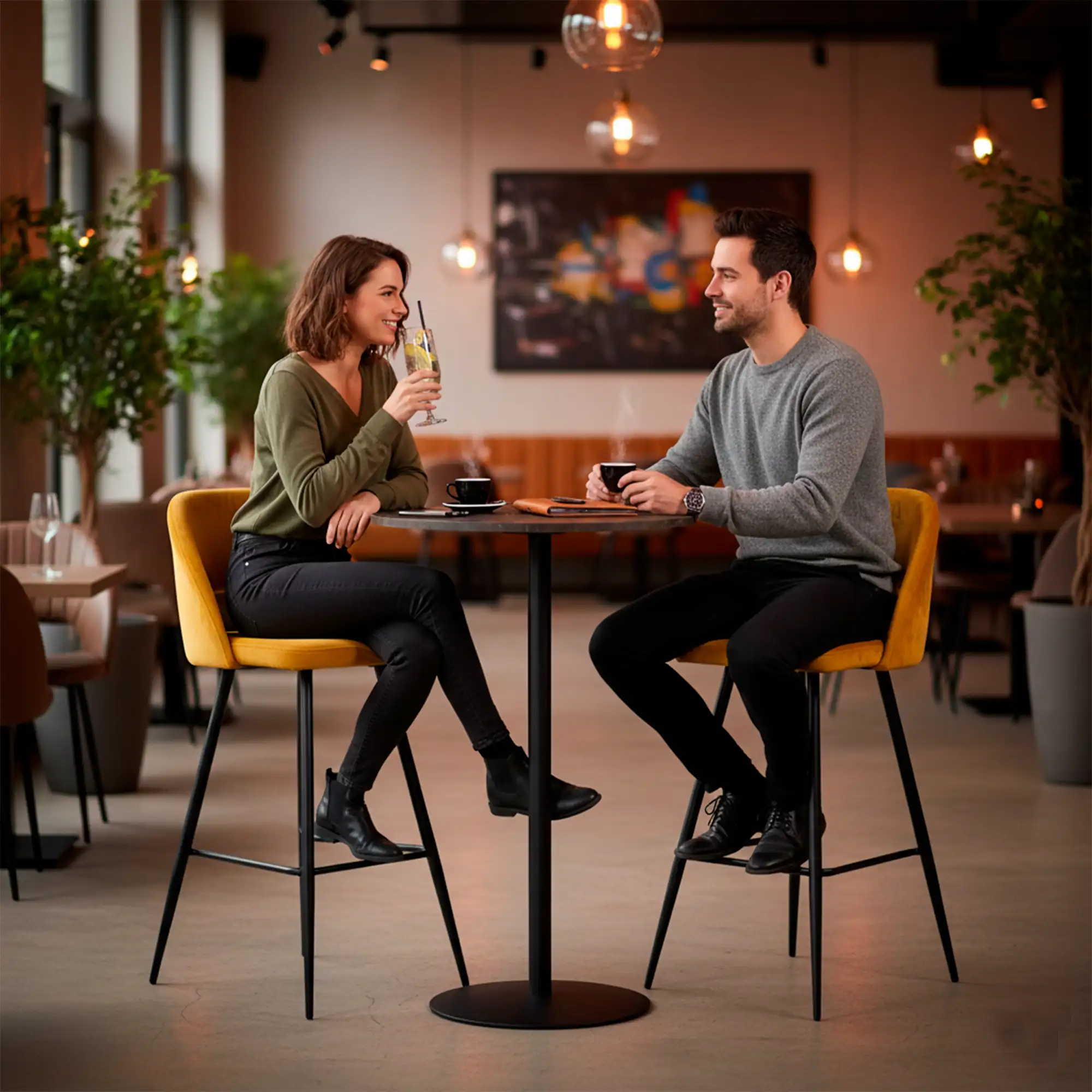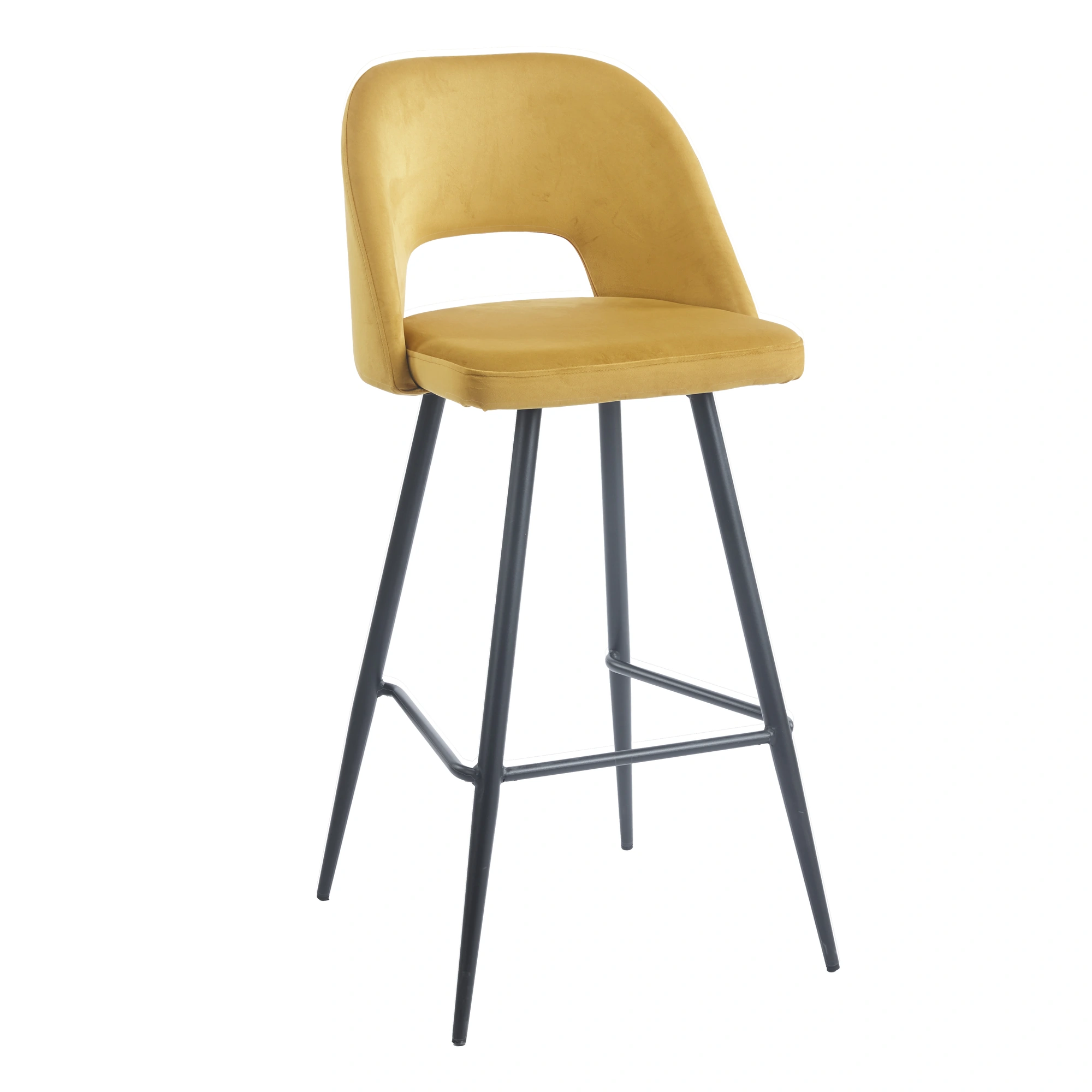 Gracias a su estructura de acero, este taburete con respaldo de interior es altamente resistente al desgaste, ideal para un uso intenso en hostelería. El tapizado en terciopelo no sólo le da un acabado premium que mejora la estética de tu local, sino que también facilita la limpieza con los productos adecuados. El respaldo tapizado añade comodidad para el cliente, fomentando que permanezca más tiempo en barra o mesa alta, lo cual puede traducirse en un mayor ticket medio. Además, el diseño en colores como el verde y el mostaza permite incorporar una nota de color que refuerce la identidad visual de tu establecimiento.